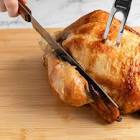 Lightly press the carving fork into the breastbone between the two breasts to stabilize the chicken as you cut. Using a sharp knife, cut the skin between the leg and the body. Test Kitchen tip: Keep paper towels or a kitchen towel nearby during the carving process. As you handle the roasted bird, your hands will start to get slippery.