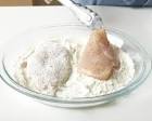 The often-missed step in basic dredging is patting the food dry. When meat is taken out of packaging it is naturally a little moist on the outside. Too much moisture makes the flour soggy which actually prevents browning; the opposite of what you want.