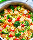 - Pre-Cooked Chicken: You can also make this using cooked leftover chicken or rotisserie chicken. Simply use 2 1/2-3 cups of protein, increase the water from 1/2 cup to 1 cup (or broth), either microwave the frozen broccoli 5 minutes or substitute with fresh broccoli, and adjust the bake time to 30-35 minutes. The rice will still be tender with this cooking method.